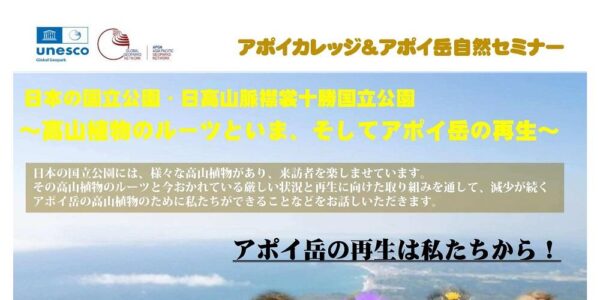 投稿日:2026年2月6日 sub_admin アポイ岳2026/02/24(火)アポイカレッジ&アポイ岳自然セミナー「日本の国立公園・日高山脈襟裳十勝国立公園 ~高山植物のルーツといま、そしてアポイ岳の再生~」 この記事を見る