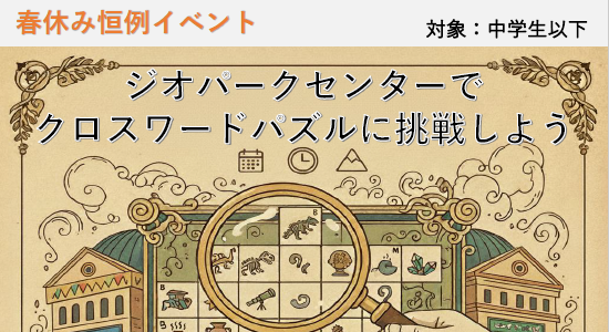 投稿日:2026年3月19日 sub_admin 南紀熊野2026/03/20(金) ~ 2026/04/08(水)春休み恒例イベント「ジオパークセンターでクロスワードパズルに挑戦しよう」を開催 この記事を見る