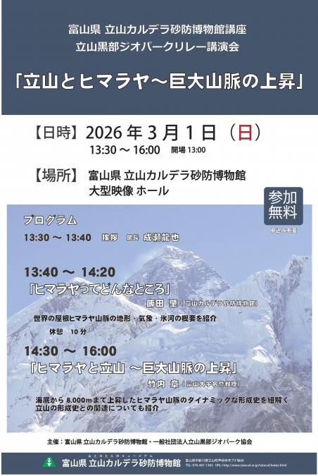 富山県 立山カルデラ砂防博物館講座/立山黒部ジオパークリレー講演会「立山とヒマラヤ~巨大山脈の上昇」