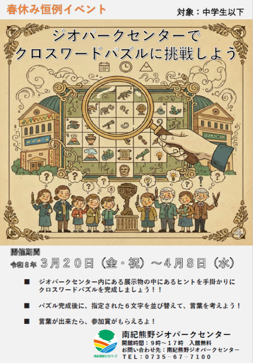 春休み恒例イベント「ジオパークセンターでクロスワードパズルに挑戦しよう」を開催